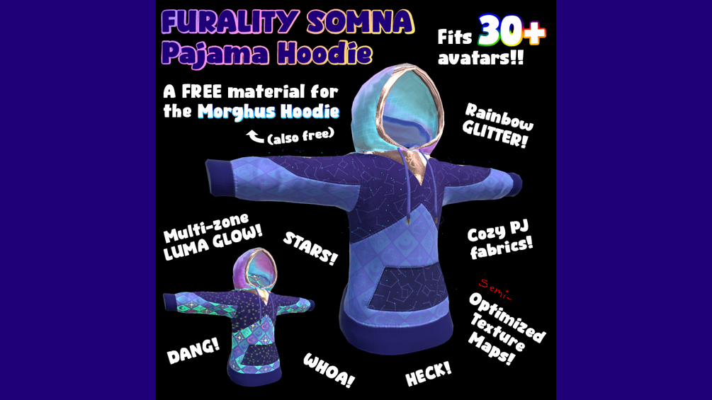 This material is made to fit ALL of the AMAZING and FREE hoodie assets made by Morghus. Unfortunately I did not have time to make a more drag-and-drop type of prefab, so you're on your own from here. If you haven't yet, visit https://morghus.gumroad.com/ and scroll down to find the hoodie that fits your avatar!